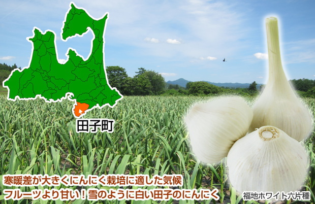 にんにく栽培を始めたのが1962年のことといわれ、以来、絶えまない品種改良によって品質の高い大玉のにんにくづくりに成功したそうです。田子にかぎらず青森産のにんにくが特別おいしいのは、厳しい寒さがにんにく本来の生育活力を引きだして糖度が高く身が引きしまったにんにくが育つからです。
